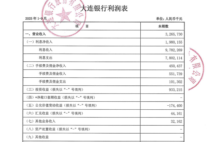 截图来自大连银行2025年三季报